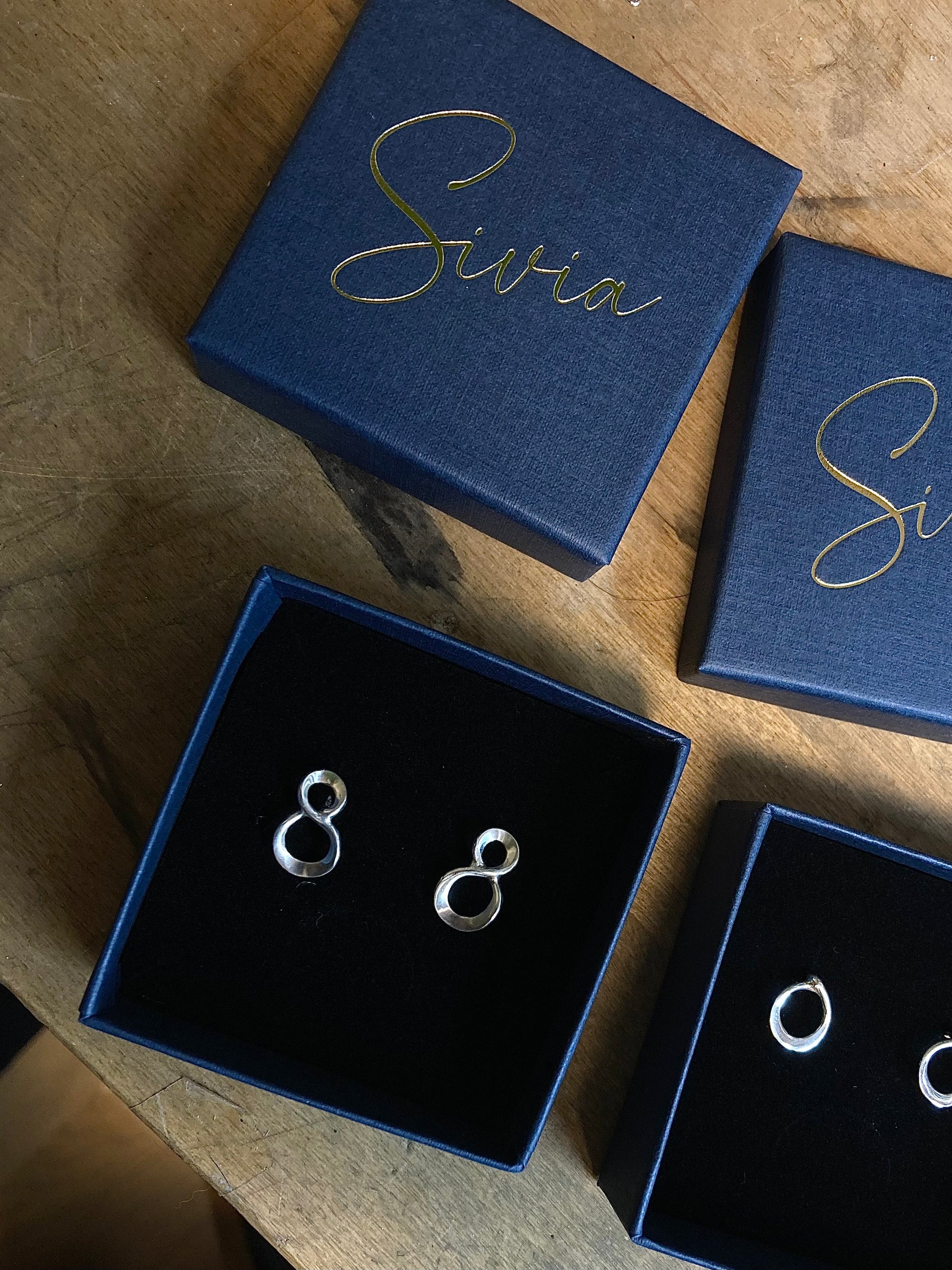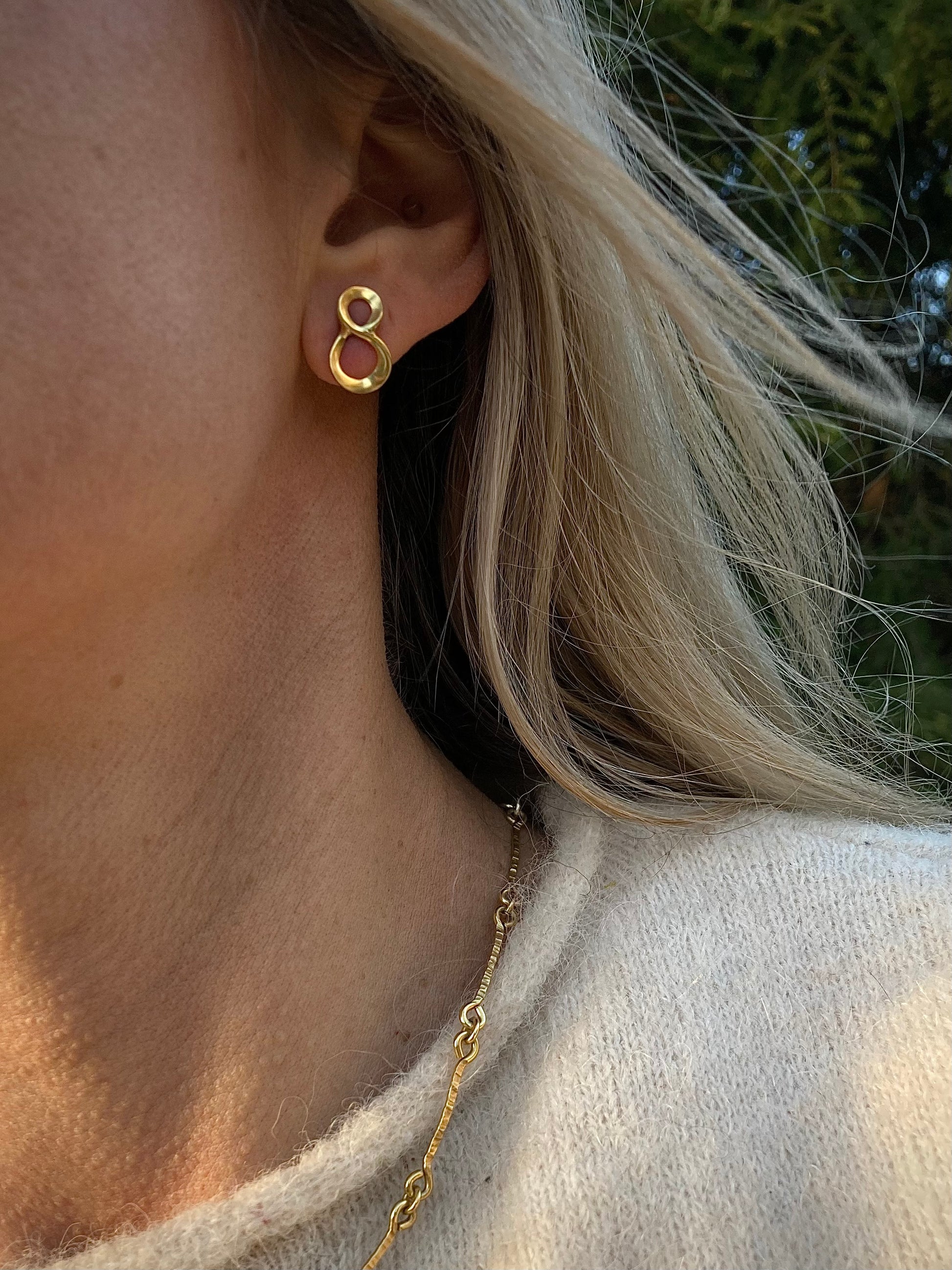 Formen er inspirert av evighetssymbolet og art nouveau-stilens levende formspråk. Hver bue er håndsmidd og svakt bøyd innover, noe som gir øredobbene en elegant fasong og et mykt, uttrykksfullt preg. Øredobbene måler ca. 17 mm i høyden og 9 mm i bredden.