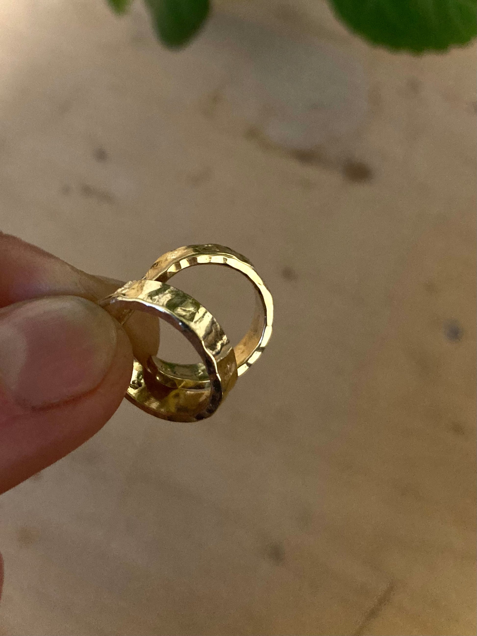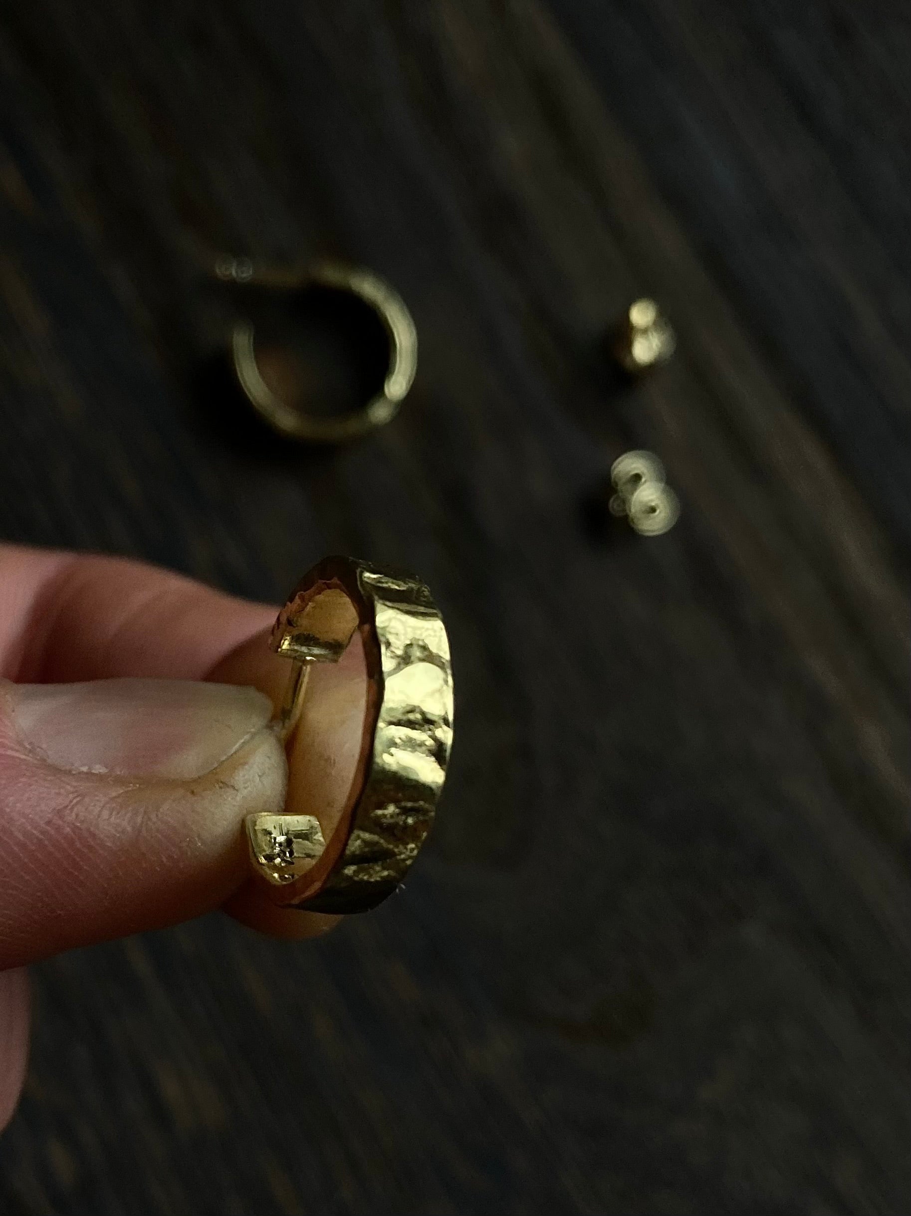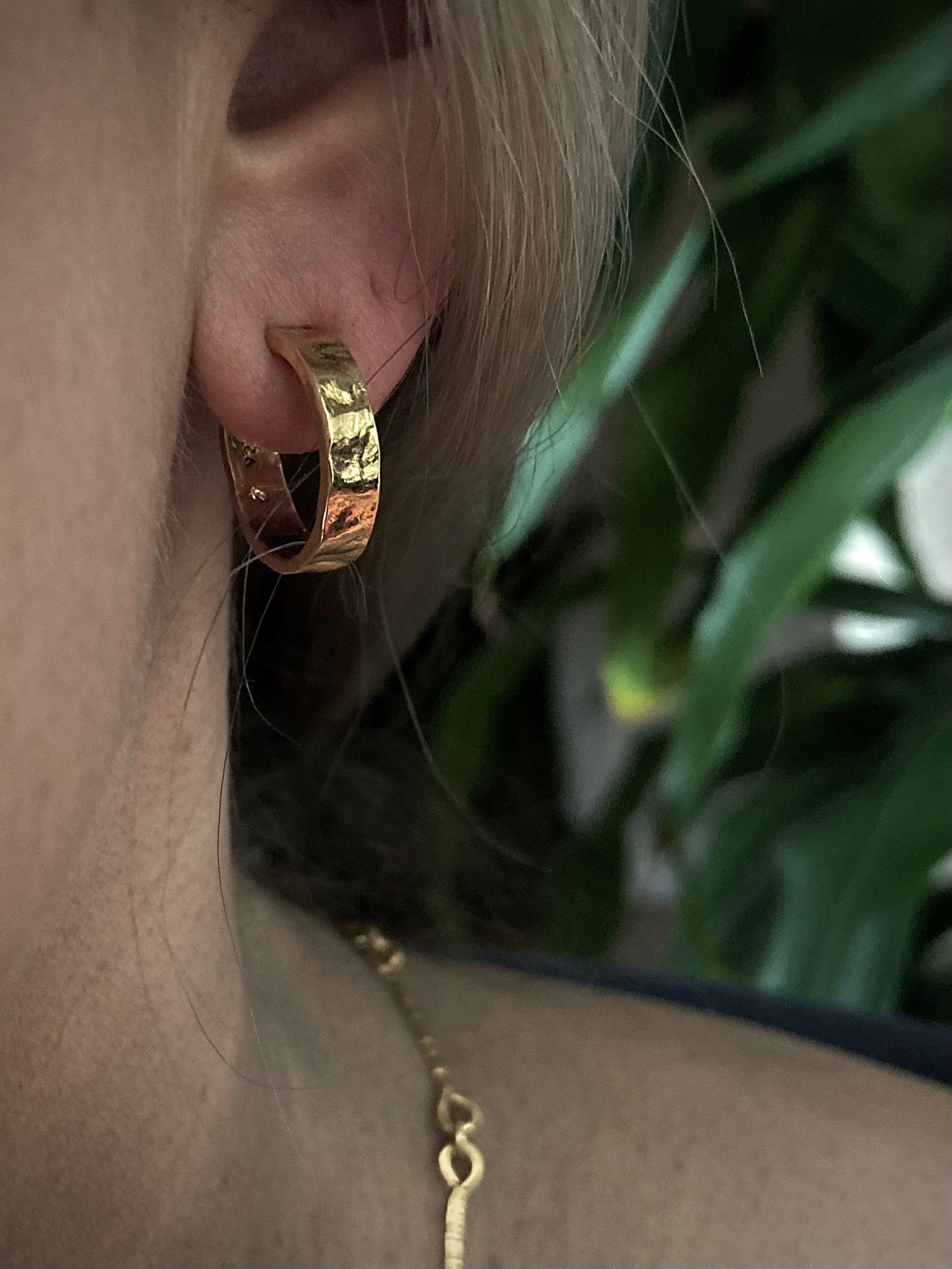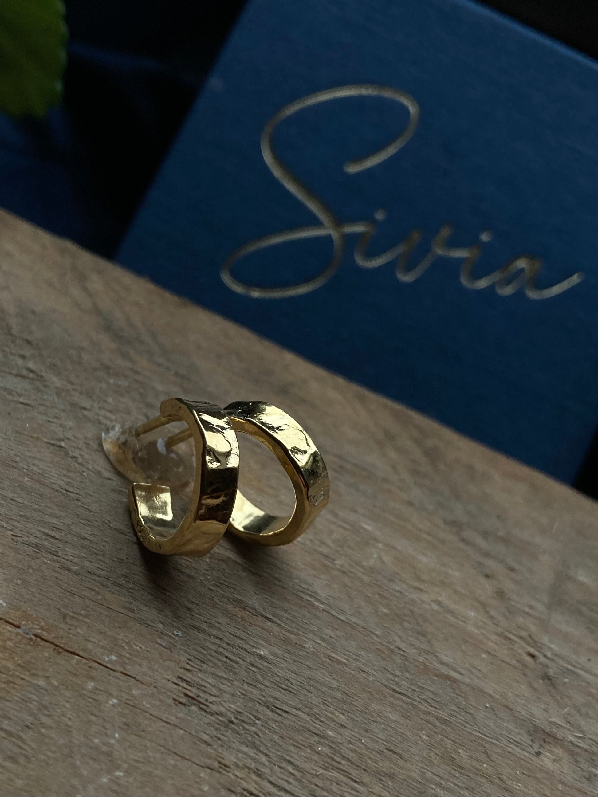 Håndlagde øreringer i 925 sølv med en røff og levende overflate. De forgylte smykkene er belagt med 23k gull.