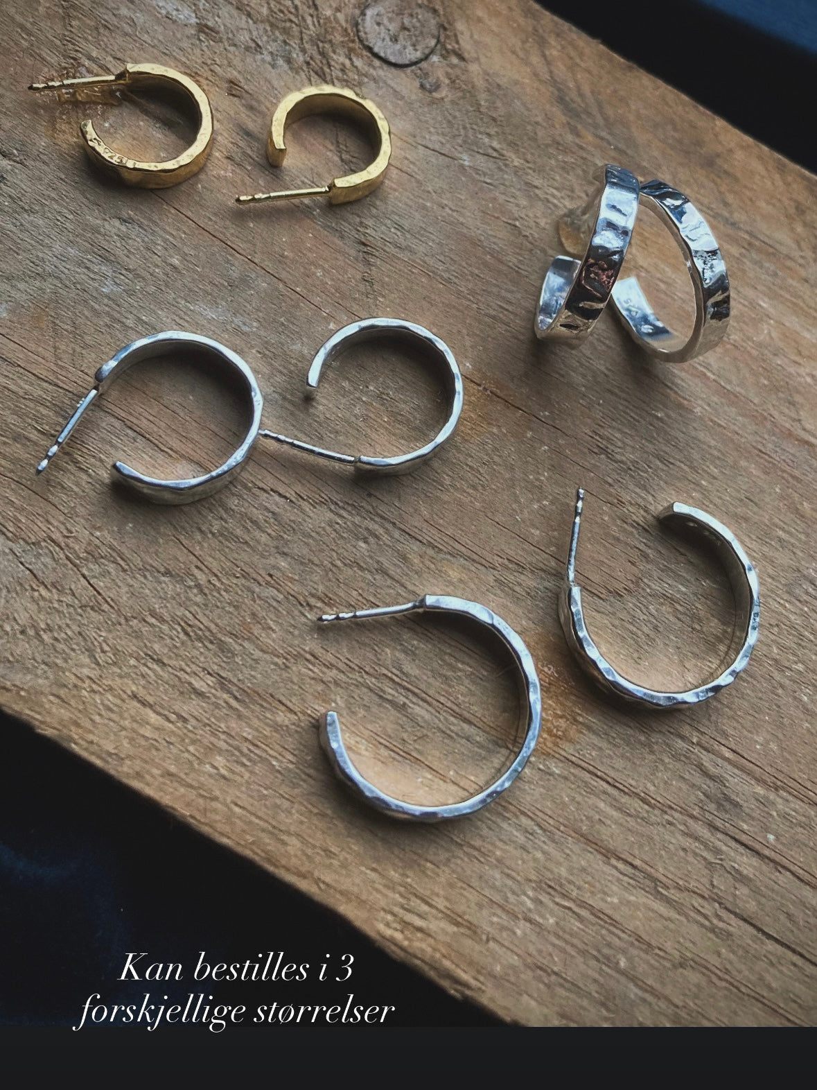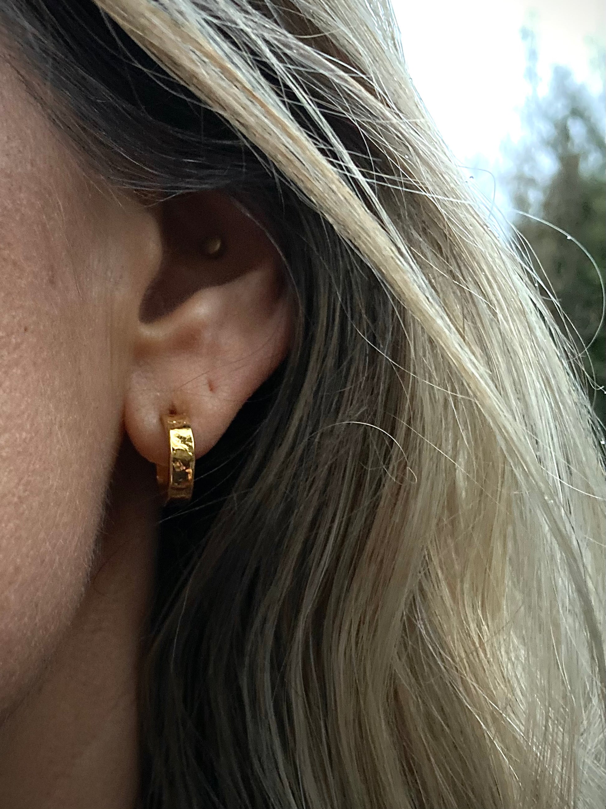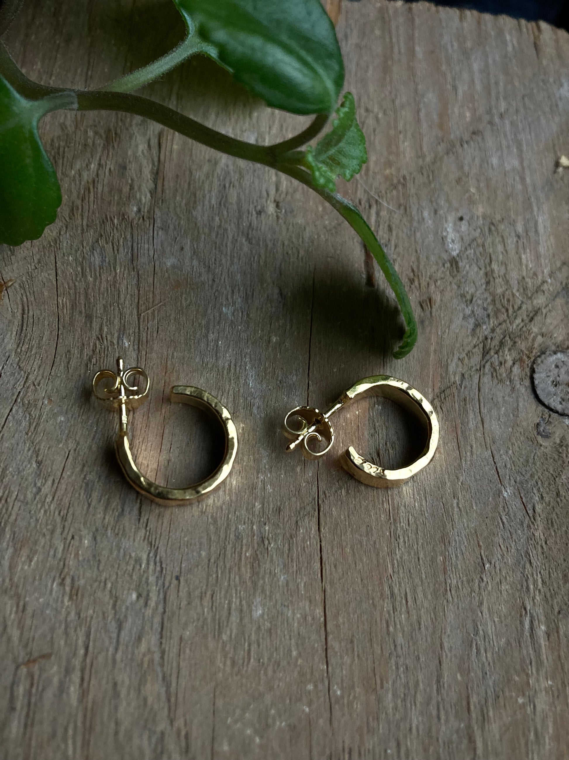 Håndlagde øreringer i 925 sølv med en røff og levende overflate. De forgylte smykkene er belagt med 23k gull.
